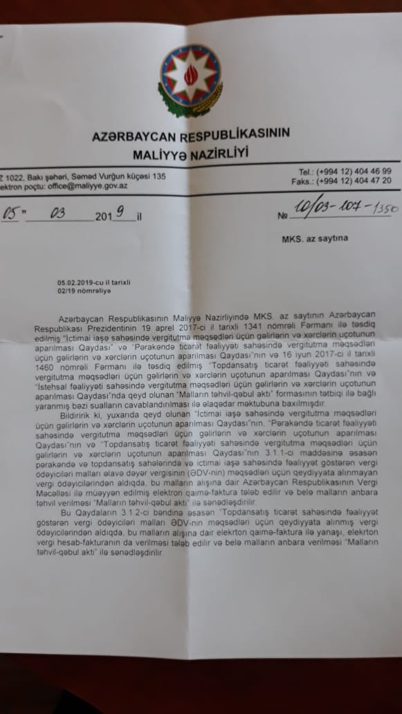 "Azərbaycan Respublikasının Maliyyə Nazirliyində mks.az saytının Azərbaycan Respublikası Prezidentinin 19 aprel 2017-ci il tarixli 1341 nömrəli Fərmanı ilə təsdiq edilmiş “İctimai iaşə sahəsində vergitutma məqsədləri üçün gəlirlərin və xərclərin uçotunun aparılması Qaydası” və “Pərakəndə ticarət fəaliyyəti sahəsindəvergitutma məqsədləri üçün gəlirlərin və xərclərin uçotunun aparılması Qaydası”nın və 16 iyun 2017-ci il tarixli 1460 nömrəli Fərmanı ilə təsdiq edilmiş “Topdansatış ticarət fəaliyyəti sahəsində vergitutma məqsədləri üçün gəlirlərin və xərclərin uçotunun aparılması Qaydası”nın və “İstehsal fəaliyyəti sahəsində vergitutma məqsədləri üçün gəlirlərin və xərclərin uçotunun aparılması Qaydası”nda qeyd olunan “Malların təhvil-qəbul aktı” formasının tətbiqi ilə bağlı yaranmış bəzi sualların cavablandırılması ilə əlaqədar məktubuna baxılmışdır.