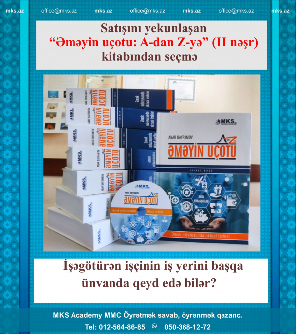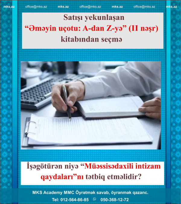 Satışını yekunlaşan “Əməyin uçotu: A-dan Z-yə” (II nəşr) kitabından seçmə   Əmək Məcəlləsinin 182-ci, “Müəssisədaxili intizam qaydaları” maddəsinin birinci hissəsin...