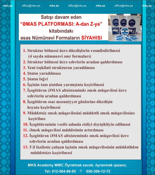 Satışı davam edən “ƏMAS PLATFORMASI: A-dan Z-yə” kitabındakı əsas 15 Nümünəvi formaların SİYAHISI1. Struktur bölmәsi üzrә düzәlişlәrin rəsmilədirilməsi (4 sayda nümunәvi...