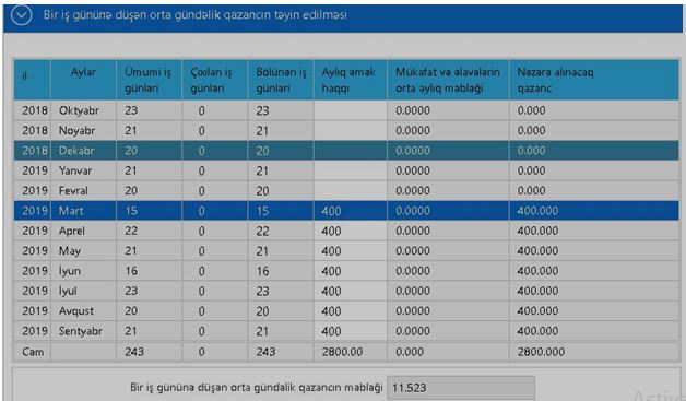 Proqram təminatından çıxarışdan göründüyü kimi işçi 2018-ci ilin sentyabr ayından 2019-cu ilin mart ayına qədər işləməsə də, iş günlərinin sayı 243 gün götürülüb. 2018-ci oktyabr ayından 2019-cu ilin sentyabr ayına olan dövrdə iş günlərinin sayı - 243 gün nəzərə alınıb. Bu səbəbdən işçiyə hesablanan orta gündəlik qazanc məbləği də az olur: 11,52 manat (2800 manat /243 gün).