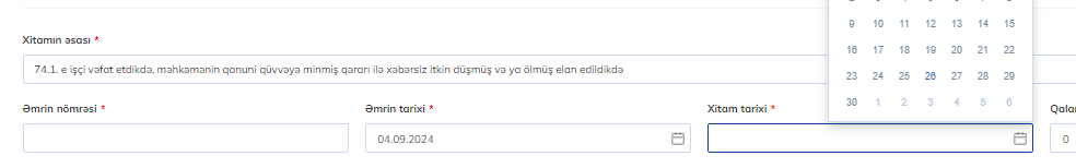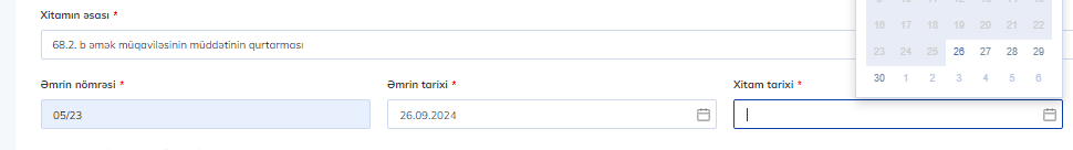 Şəkildən göründüyü kimi, xitam əmri 26 sentyabr 2024-cü il tarixdə hazırlandığı üçün öncəki tarixləri seçməyə məhdudiyyət tətbiq edilir.