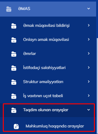 ƏMAS altsisteminə edilən son dəyişikliklərdən biri də məhkumluq arayışının bu altsistemə yüklənməsidir. İşəgötürən ƏMAS altsisteminin “Təqdim olunan arayışlar” bölməsinin “Məhkumluq haqqında arayışlar” altbölməsində işçinin məhkumluq haqqında arayışları ilə tanış ola bilər.
