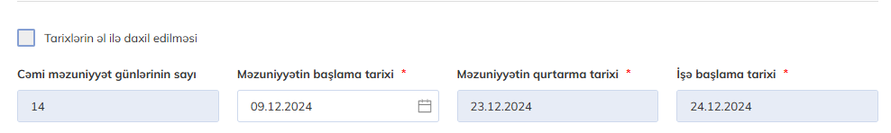 Çünki ƏMAS altsistemində 23 dekabr 2024-cü il tarixini qeyri-iş günü kimi qeyd ediblər. Bu səbəbdən ƏMAS altsistemində məzuniyyət əmri qeyd edilən zaman məzuniyyət dövrünə 23 dekabr 2024-cü il tarixi təsadüf edərsə, bu zaman “tarixlərin əl ilə daxil edilməsi” menyusundan istifadə etmək lazımdır. Misalımızda qeyd edilən halda, işçinin işə başlanma tarixi 24 dekabr yox 23 dekabr 2024-cü il tarixi qeyd etməyə ehtiyac yaranacaq.
