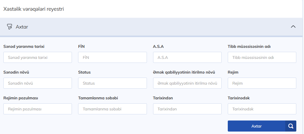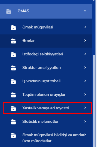 İşəgötürən işçilərin xəstəlik vərəqəsi üzrə məlumatlarla tanış olmaq üçün ƏMAS altsistemində “ƏMAS” bölməsinin “Xəstəlik vərəqələri reyestri” altbölməsinə daxil olmalıdır: