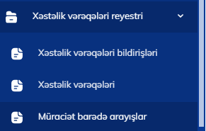 İşəgötürən “xəstəlik vərəqələri reyestri” bölməsində “xəstəlik vərəqələri bildirişləri”, “xəstəlik vərəqləri” və “müraciət barədə arayışlar” altbölmələrindən istifadə edə bilər. Həmin bölmədə işçilərin xəstəlik vərəqəsində qeyd edilən məlumatların əksəriyyəti (işçi haqqında məlumatlar, əmək qabiliyyətinin itirilmə növü , Rejim, Rejimin pozulması və s) əks olunur.