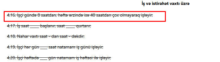 ƏMAS altsistemində edilən son dəyişiklik nəticəsində işəgötürən “iş rejimi” bölməsində yalnız beşgünlük və ya altıgünlük iş həftəsinə müvafiq bölmələri seçdikdə, 4.16-ci bənd aktiv olacaq. İşəgötürən “iş rejimi”ndə fərqli iş rejimi seçdikdə halda isə əmək müqaviləsinin 4.16- 4.20-cu bəndlərinin üzərindən xətt çəkilir:
