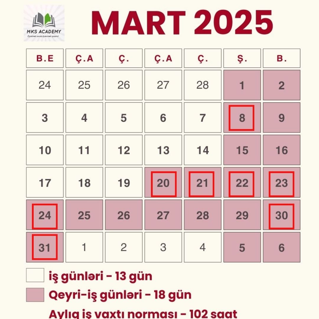 Beləliklə, qərardan sonra 2025-ci ilin mart ayı üzrə beşgünlük iş rejimi üzrə istehsalat təqvimi aşağıdakı şəkildə olacaq (qırmızı çərçivədə qeyd edilən tarixlər rəsmi olaraq bayram günü hesab edilən günlərdir):