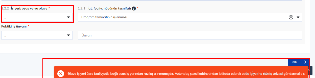 Xəbər verdiyimiz kimi, bu il fevralın 13-də ƏMAS altsistemində edilən dəyişikliyə əsasən, əsas iş yeri üzrə əmək müqaviləsi bağlayan işçi əlavə iş yerində işləmək üçün  mütləq  əsas iş yeri üzrə işəgötürənin razılığını almalıdır. Əgər işəgötürən əsas iş yeri üzrə əmək müqaviləsi bağladığı zaman “Əlavə iş yeri üzrə müqavilə bağlanarkən razılıq alınsın” altbölməsini aktiv edərsə, işçi heç bir işəgötürənlə əlavə iş yeri üzrə əmək müqaviləsi bağlaya bilməyəcək. Çünki əlavə iş yeri üzrə işəgötürən işçinin əmək müqaviləsini hazırladıqda müvafiq bölmədə “Əlavə” seçdikdə aşağıdakı formada məhdudiyyətlə qarşılacaq: