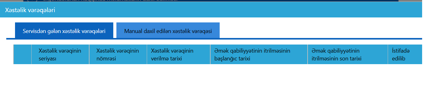 Şəkildən göründüyü kimi, elektron sənəd formasında təqdim edilən xəstəlik vərəqələri "servisdən gələn xəstəlik vərəqələri" bölməsinə təsnifləşdirilir. Kağız formada tərtib olunan xəstəlik vərəqələri üzrə məlumatlar isə "manual daxil edilən xəstəlik vərəqələri" bölməsində yerləşdirilir.
