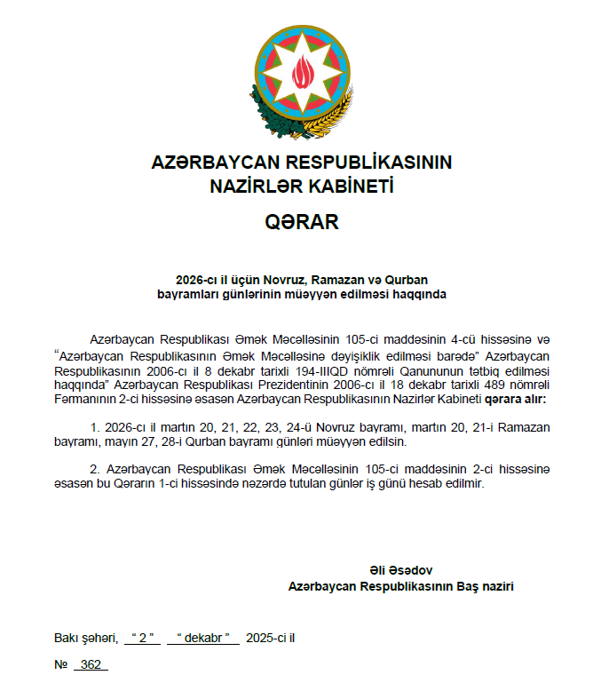 Xəbər verildiyi kimi, Nazirlər Kabinetinin 2 dekabr 2025-ci il tarixli, 362 nömrəli qərarı ilə 2026-cı il üçün Novruz, Ramazan və Qurban bayramları günləri müəyyən edilmişdir. Qərara əsasən, 2026-cı il martın 20, 21, 22, 23 və 24-ü Novruz bayramı, martın 20 və 21-i Ramazan bayramı, mayın 27 və 28-i isə Qurban bayramı günləri kimi təsdiq olunmuşdur. Qeyd olunan bu tarixlər Əmək Məcəlləsinin 105-ci maddəsinin 2-ci hissəsinə uyğun olaraq iş günü hesab edilmir.