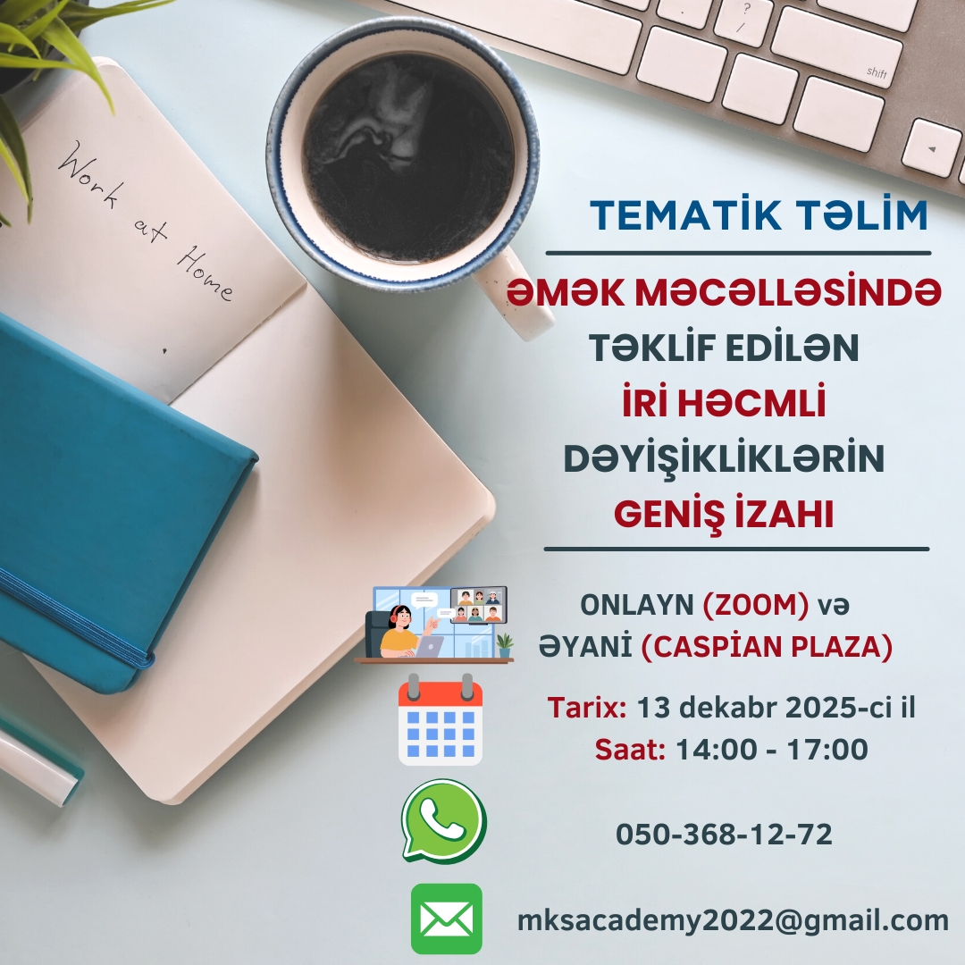Qeyd edək ki, 13 dekabr 2025-ci il tarixində “MKS Academy” tərəfindən keçiriləcək “Əmək Məcəlləsinə təklif edilən son dəyişikliklərin izahı” mövzusunda tematik təlimdə bu və digər yeniliklərlə bağlı ətraflı məlumat təqdim olunacaq. İştirak üçün 050-368-12-72 (WhatsApp aktivdir) nömrəsinə və ya mksacademy2022@gmail.com elektron poçt ünvanına müraciət edə bilərsiniz.