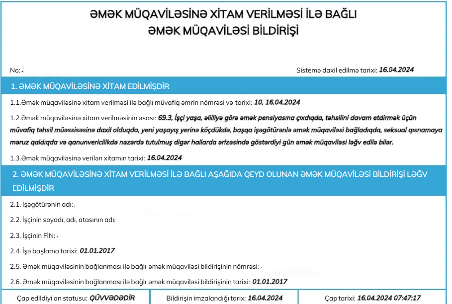 Eyni zamanda, işəgötürən tərəfindən əmək müqaviləsinə xitam verildiyi halda, bu barədə məlumatlar işçinin şəxsi kabinetinə avtomatik şəkildə ötürülür.
