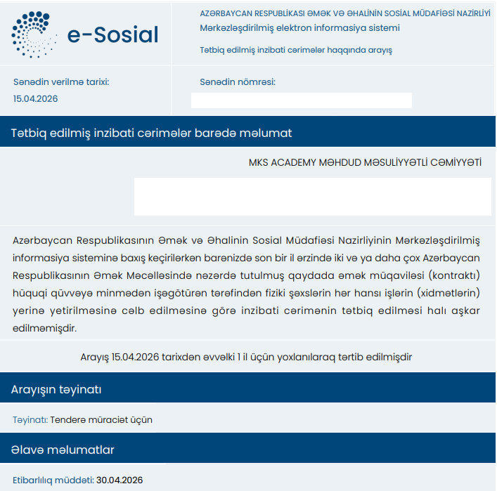 İşəgötürənlər ƏMAS platformasından Dövlət Əmək Müfəttişliyi Xidməti tərəfindən son 1 il ərzində əmək qanunvericiliyi ilə bağlı tətbiq edilən inzibati cərimələr haqqında arayışı əldə etmək imkanına malik idilər. Həmin arayış forması əsasən tenderlərdə iştirak zamanı tələb olunan sənədlərdən biri idi.