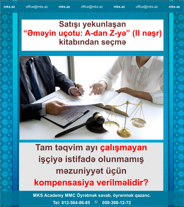 Satışı yekunlaşan "Əməyin uçotu: A-dan Z-yə" (II nəşr) kitabından seçmə Təcrübədə ən çox müzakirə olunan hallardan biri də tam təqvim ayı çalışmayan işçilərə kompensa...