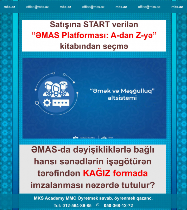 Satışına START verilən "ƏMAS Platforması: A-dan Z-yə" kitabından seçmə İşəgötürən tərəfindən işçinin əmək müqaviləsində hər hansı dəyişiklik həyata keçirildikdə, ƏMA...