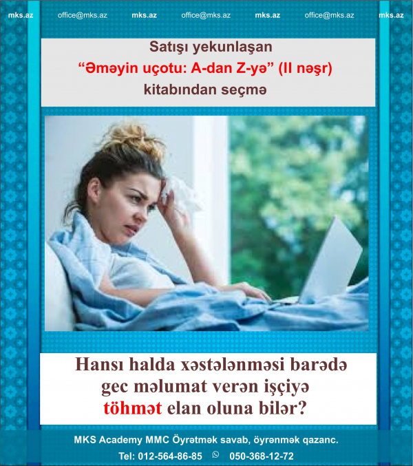 Satışı yekunlaşan “Əməyin uçotu: A-dan Z-yə” (II nəşr) kitabından seçmə Xəstələnən işçinin işə gəlməyəcəyi barədə işəgötürənə vaxtında məlumat verməməsi müə...