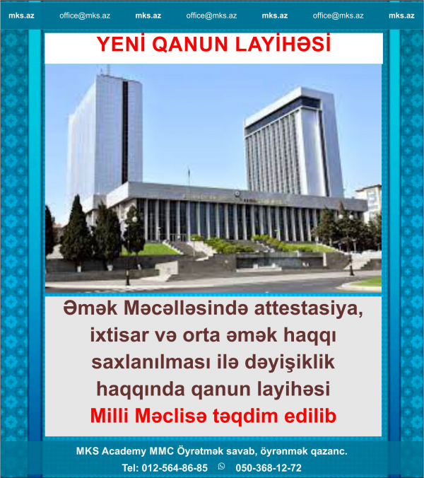 Əmək Məcəlləsinə dəyişiklik haqqında qanun layihəsi Milli Məclisin müzakirəsinə təqdim edilib. Təqdim edilən layihənin məqsədi işçilərin peşə hazırlığı səviyy...
