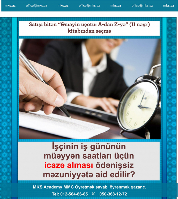 Həmkarlarımızı maraqlandıran məsələlərdən biri də, saatlıq icazənin necə tənzimlənməsidir. İşçinin iş gününün müəyyən saatları üçün icazə alması ödənişsiz məzuniyyətə aid edilir?