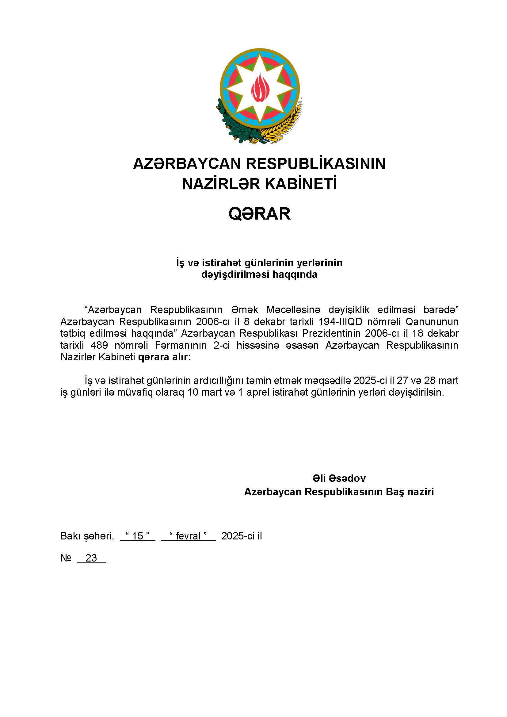 İş və istirahət günlərinin ardıcıllığını təmin etmək məqsədilə 2025-ci il 27 və 28 mart iş günləri ilə müvafiq olaraq 10 mart və 1 aprel istirahət günlərinin yerləri dəyişdirilir.
