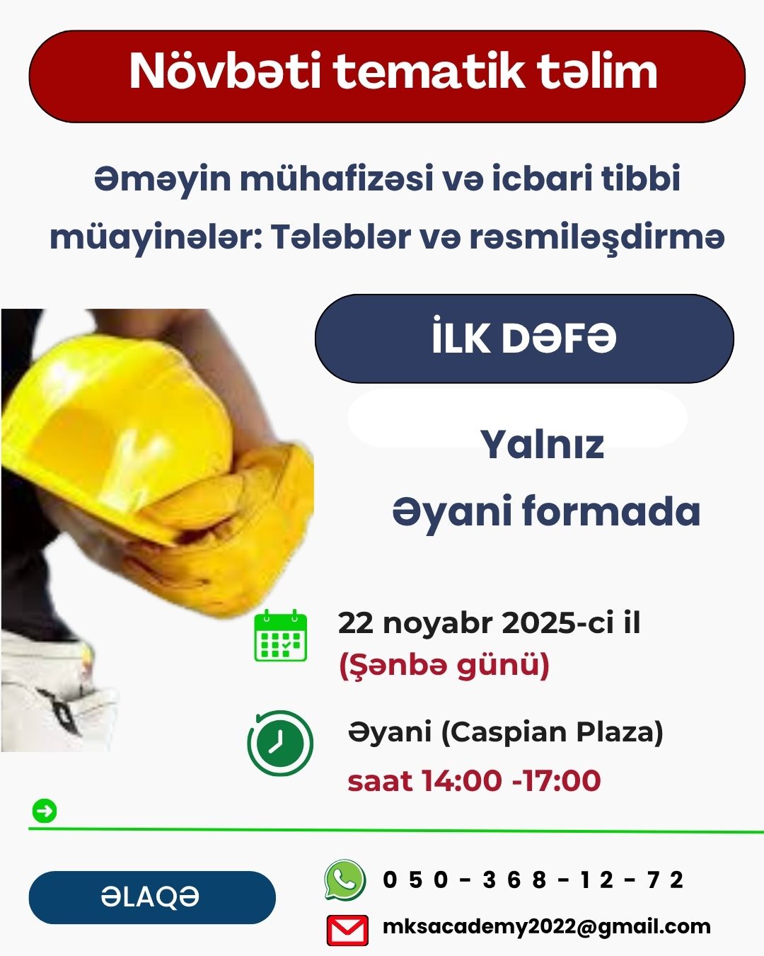Sabah — 22 noyabr 2025-ci il (şənbə günü) keçiriləcək “Əməyin mühafizəsi və icbari tibbi müayinələr” mövzusunda tematik təlimdə həmçinin ƏMAS altsistemində tətbiq olunan son yeniliklər barədə də geniş məlumat veriləcək. Təlim əyani şəkildə Caspian Plazada təşkil olunacaq. İştirak üçün 050-368-12-72 nömrəsi ilə (WhatsApp aktivdir) əlaqə saxlamaq kifayətdir.