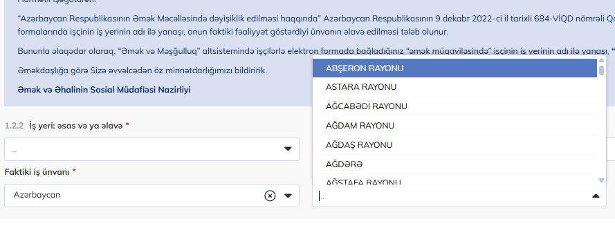 İşçinin Azərbaycan daxilindəki ünvanı daxil ediləcəksə, ölkələr siyahısından “Azərbaycan” seçildikdən sonra rayonlar bölməsi aktiv olur. Daha sonra üçüncü bölmədə küçə, bina və digər məlumatlar əl ilə qeyd edilir.