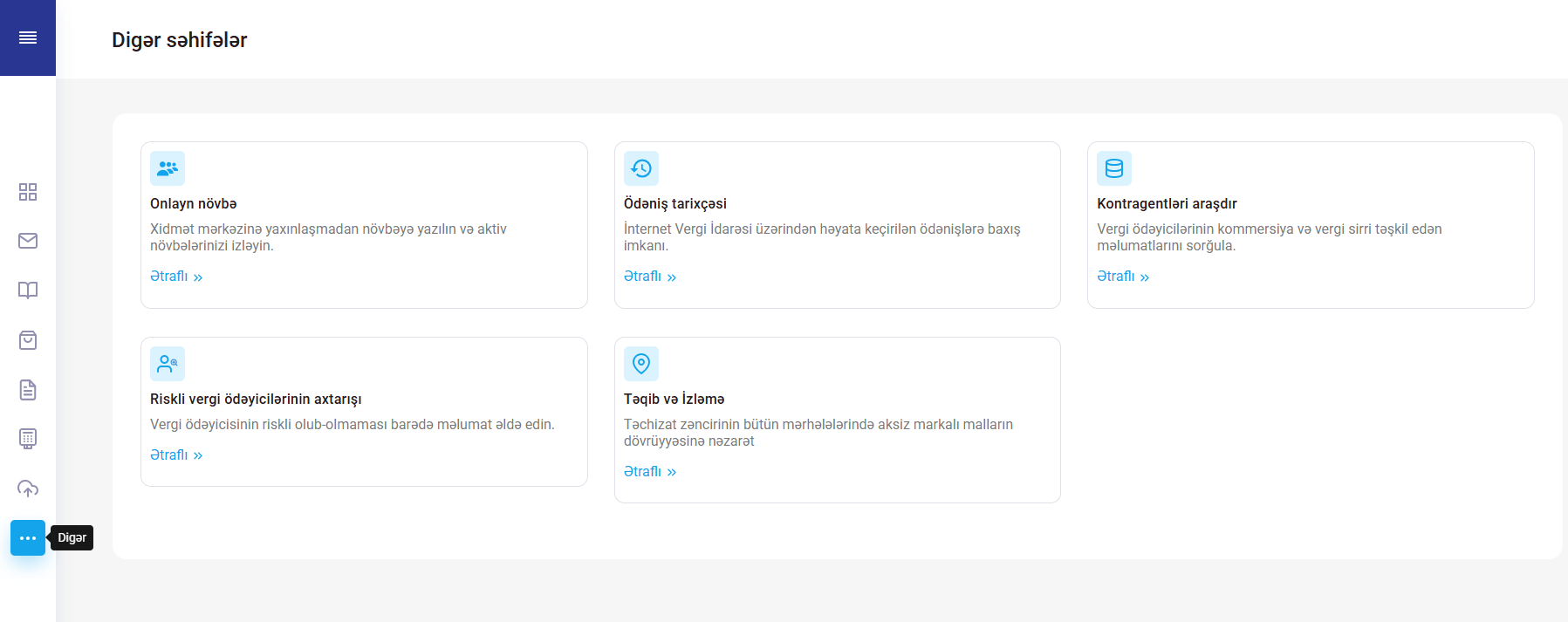 “Kontragentləri araşdır” elekron xidmətindən istifadə etmək üçün şəxsi kabinetdən "digər səhifələr" bölməsində “Kontragentləri araşdır” düyməsini sıxmaq lazımdır: