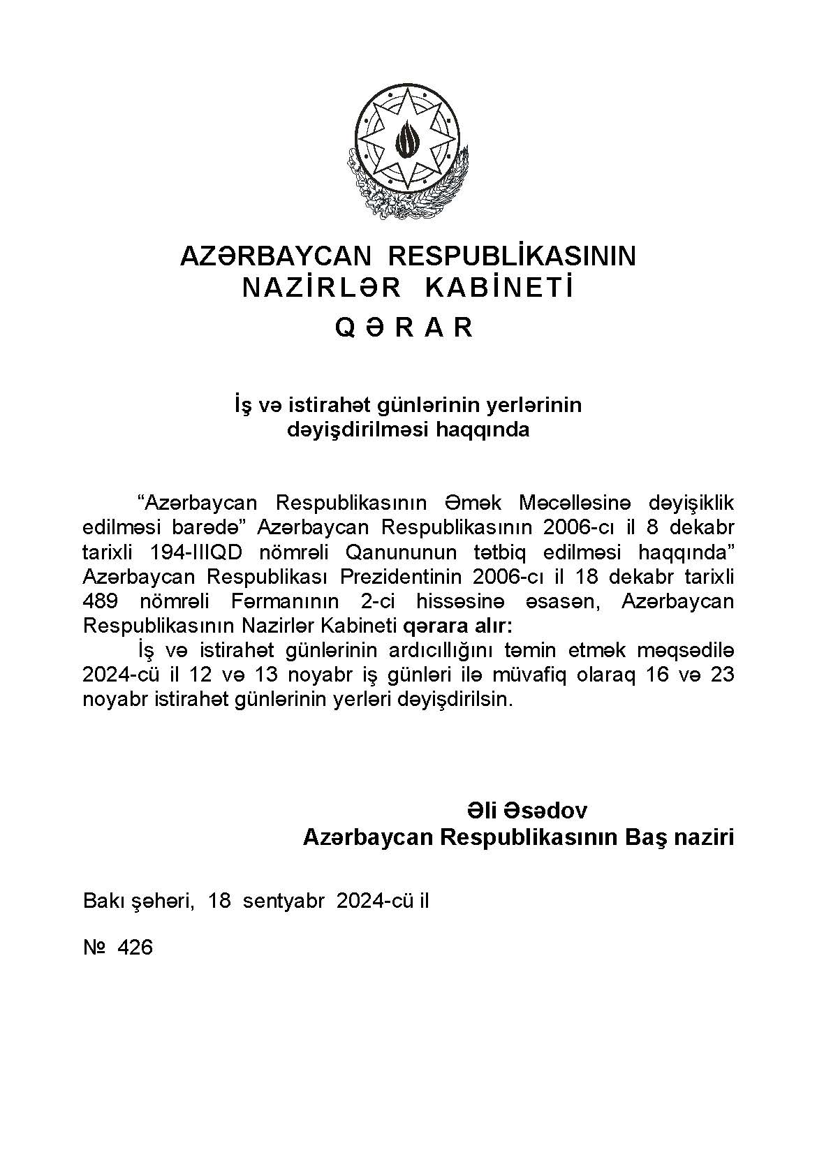 Azərbaycan Respublikasının Baş naziri Əli Əsədovun 18 sentyabr 2024-cü il, 426 saylı qərarı ilə İş və istirahət günlərinin ardıcıllığını təmin etmək məqsədilə 2024-cü il 12 və 13 noyabr iş günləri ilə müvafiq olaraq 16 və 23 noyabr istirahət günlərinin yerləri dəyişdirilib.