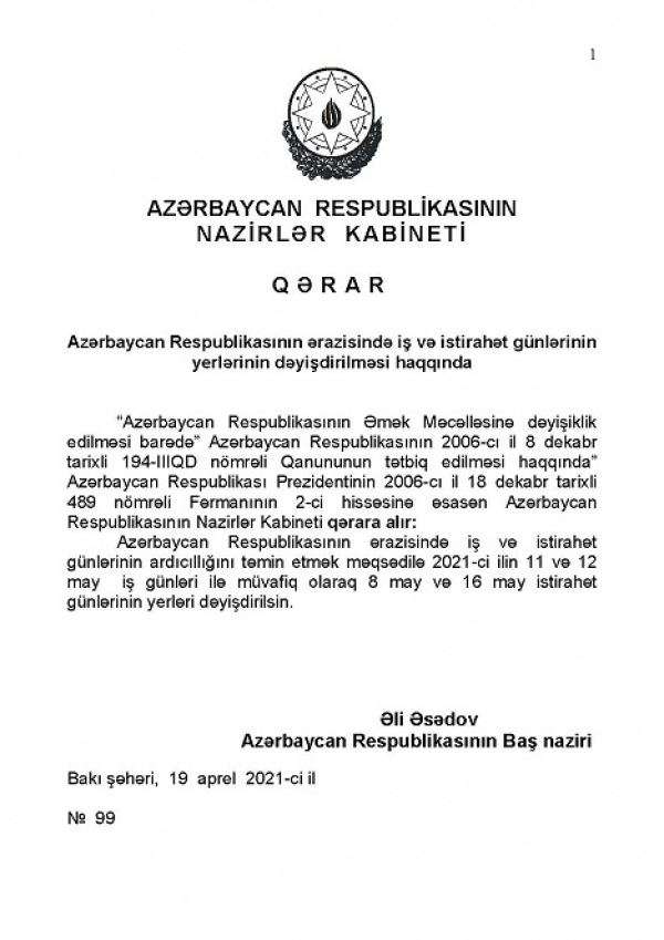 Azərbaycan Respublikasının Baş naziri Əli Əsədov 99 saylı, 19 aprel 2021-ci il tarixli qərarı ilə 2021-ci ilin may ayında istirahət və iş günıərinin yerləri dəyişdirilib. Qəra...