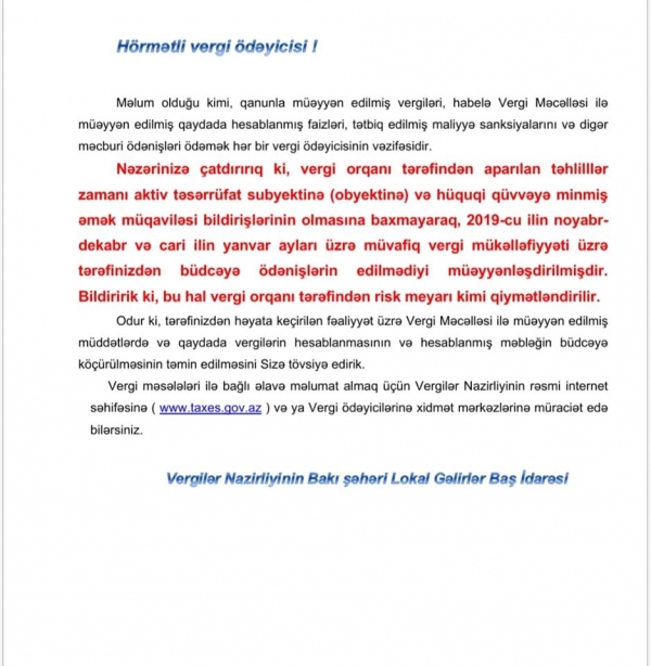 Vergi bildirişinin əsl səbəbi: davamsızlıq barədə xəbərdarlıq, yoxsa həyəcan siqnalı?! (Araşdırma yazı)