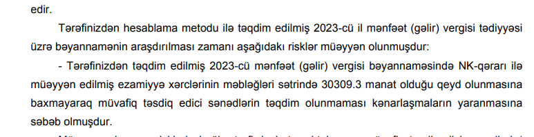 Təcrübədə ezamiyyə xərcləri ilə bağlı daxil olan kameral uyğunsuzluq səbəblərindən biri də, bəyannamədə qeyd edilən ezamiyyə məbləğinin çox olması səbəbindən vergi orqanında şübhələrin yaranmasıdır. Bu cür hallarda vergi orqanı aşağıdakı məzmunda kameral uyğunsuzluq məktubu göndərir: