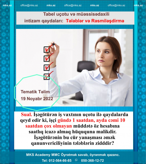 19 noyabr 2022-ci il tarixdə, saat 15:00-da keçiriləcək. "Tabel uçotu və müəssisədaxili intizam qaydaları: Tələblər və Rəsmiləşdirmə" mövzusunda təlimdə müzakirə olunacaq SUAL...