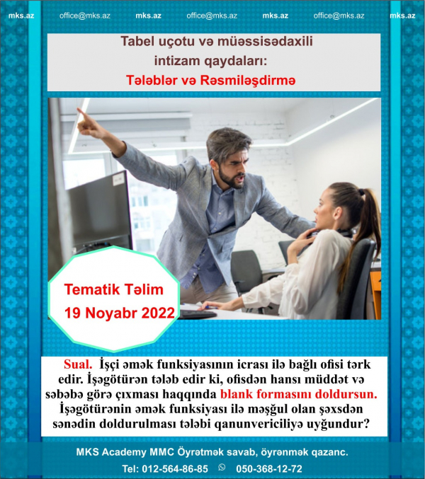 "Tabel uçotu və müəssisədaxili intizam qaydaları: Tələblər və Rəsmiləşdirmə" mövzusunda təlimdə müzakirə olunacaq SUAL