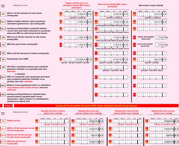Açıqlama: Qaydalardan göründüyü kimi, vergi ödəyicisi hesabat ayında ümümi dövriyyə, daxil olan dövriyyə yanaşı, dövrünün əvvəlində qalıq, yaranan, ödənilən və dövrünün sonuna olan qalıq borcları haqqıqnda məlumat verilməlidir. Vergilər Nazirliyinin hazırladığı misalda, dövrün əvvəlinə debitor borcu yaranmadığı üçün gösəərici qeyd edilməyib. O səbəbdən cari hesabat dövründə ödənilən debitor borcları da yaranması mümkün olmayıb. Amma ay ərzində yaranan debitor borcları həm də dövrünün sonuna qalıq debitor borc edib.