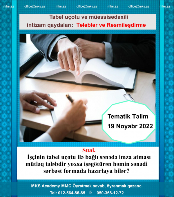 19 noyabr 2022-ci il tarixdə, saat 15:00-da keçiriləcək.  "Tabel uçotu və müəssisədaxili intizam qaydaları: Tələblər və Rəsmiləşdirmə" mövzusunda müzakirə olunacaq SUAL ...