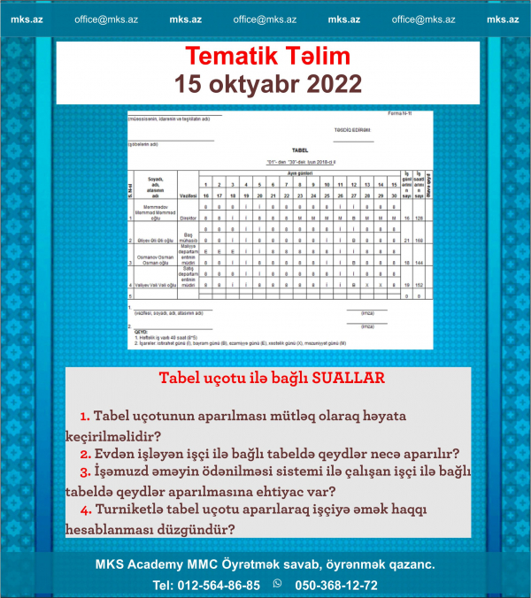 15 oktyabr 2022-ci il tarixdə “Beşgünlük iş rejimindən iş vaxtının cəmlənmiş uçotunadək" mövzusunda keçiriləcək tematik təlimdə müzakirə olunacaq sualTabel uçotu ilə bağ...