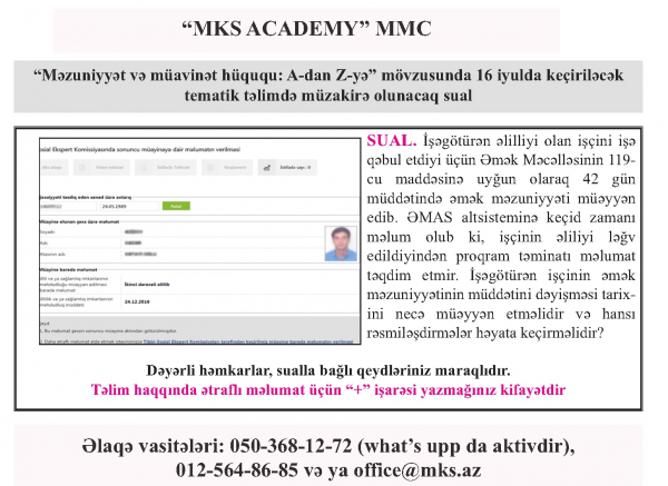 “Məzuniyyət və müavinət hüququ: A-dan Z-yə” mövzusunda 16 iyulda keçiriləcək tematik təlimdə müzakirə olunacaq sual SUAL. İşəgötürən əlilliyi olan işçini işə qəbul etdi...